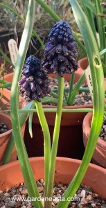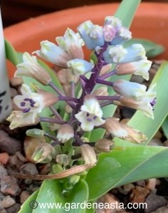 The unopened buds are very pink, the apex of the raceme is quite pointed and the leaves are wider than those of the other bulbs I have in the pot.
