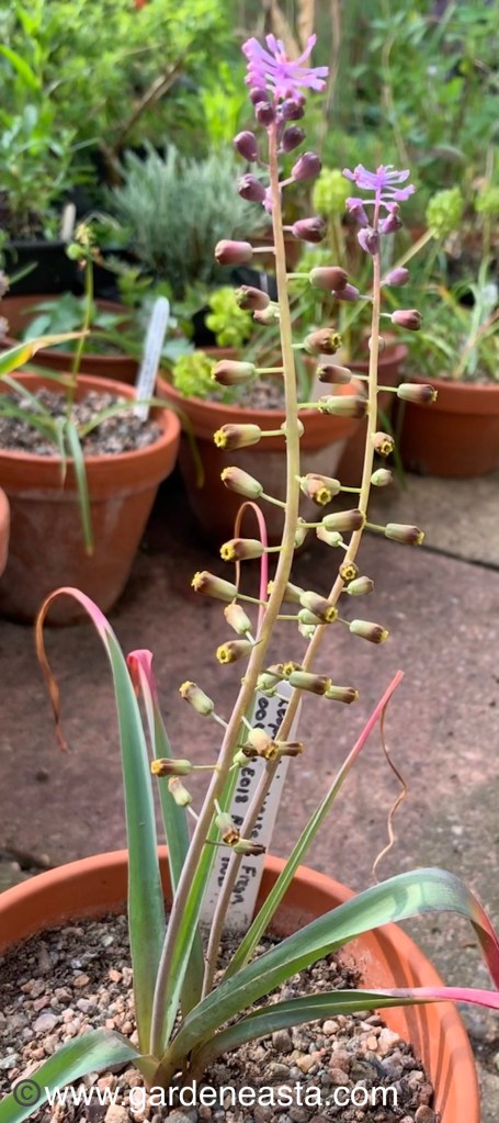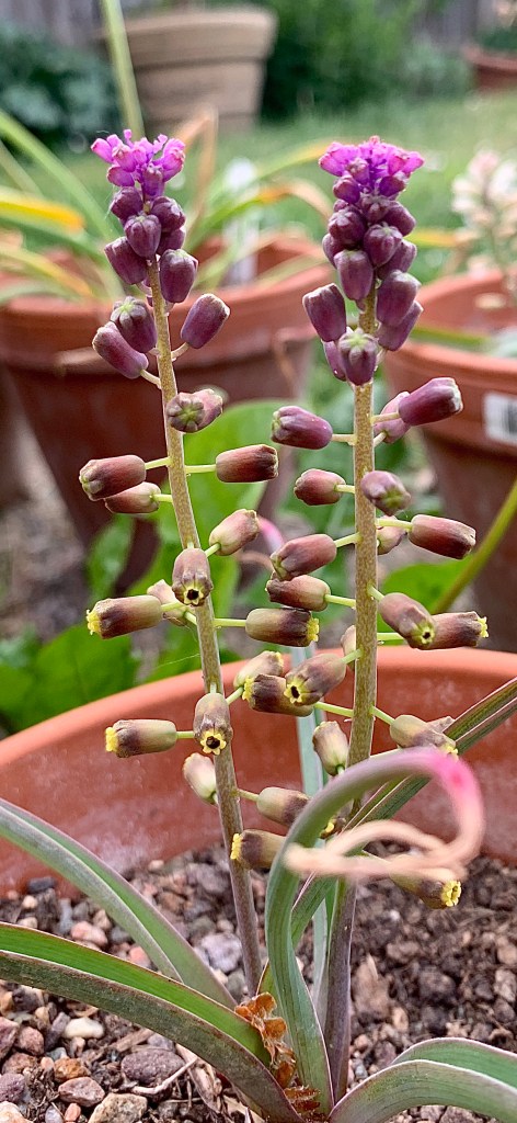 ‘ Stems up to 30cm tall, bearing a lax cylindrical tassel Hyacinth type spike of flowers. The lower fertile ones are deep brown bronze, and pale brown with yellow teeth, the upper sterile tassel is purple to violet and even pinkish in some plants.’