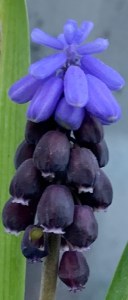 Lime green in bud, on flowering the sterile flowers appear almost neon blue above the dark purple fertile flowers with their tiny white lobes.