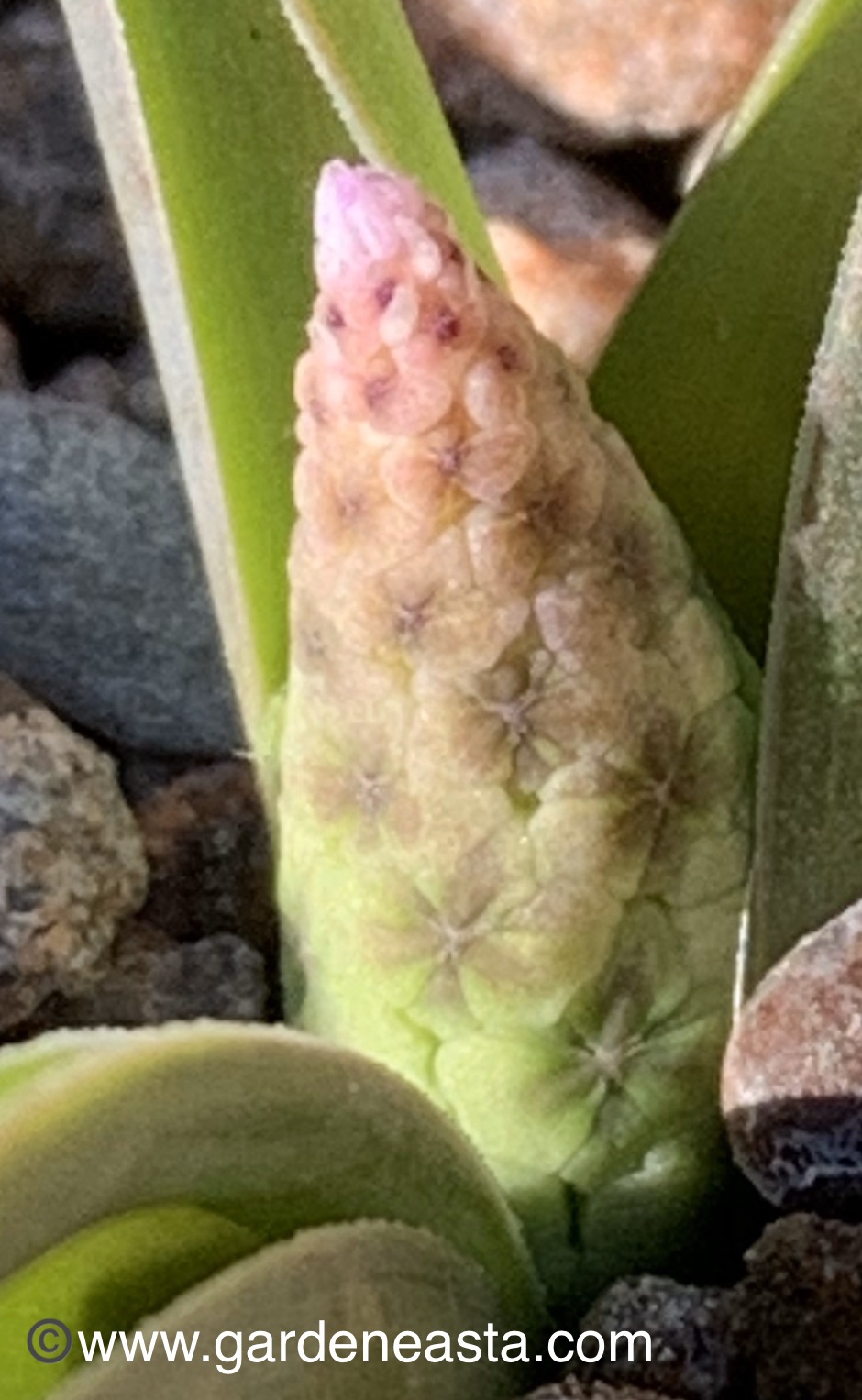 ‘The sterile flowers are violet and constitute only a small section of the flowering spike. The fertile flowers are purple before their pollen ripens.’