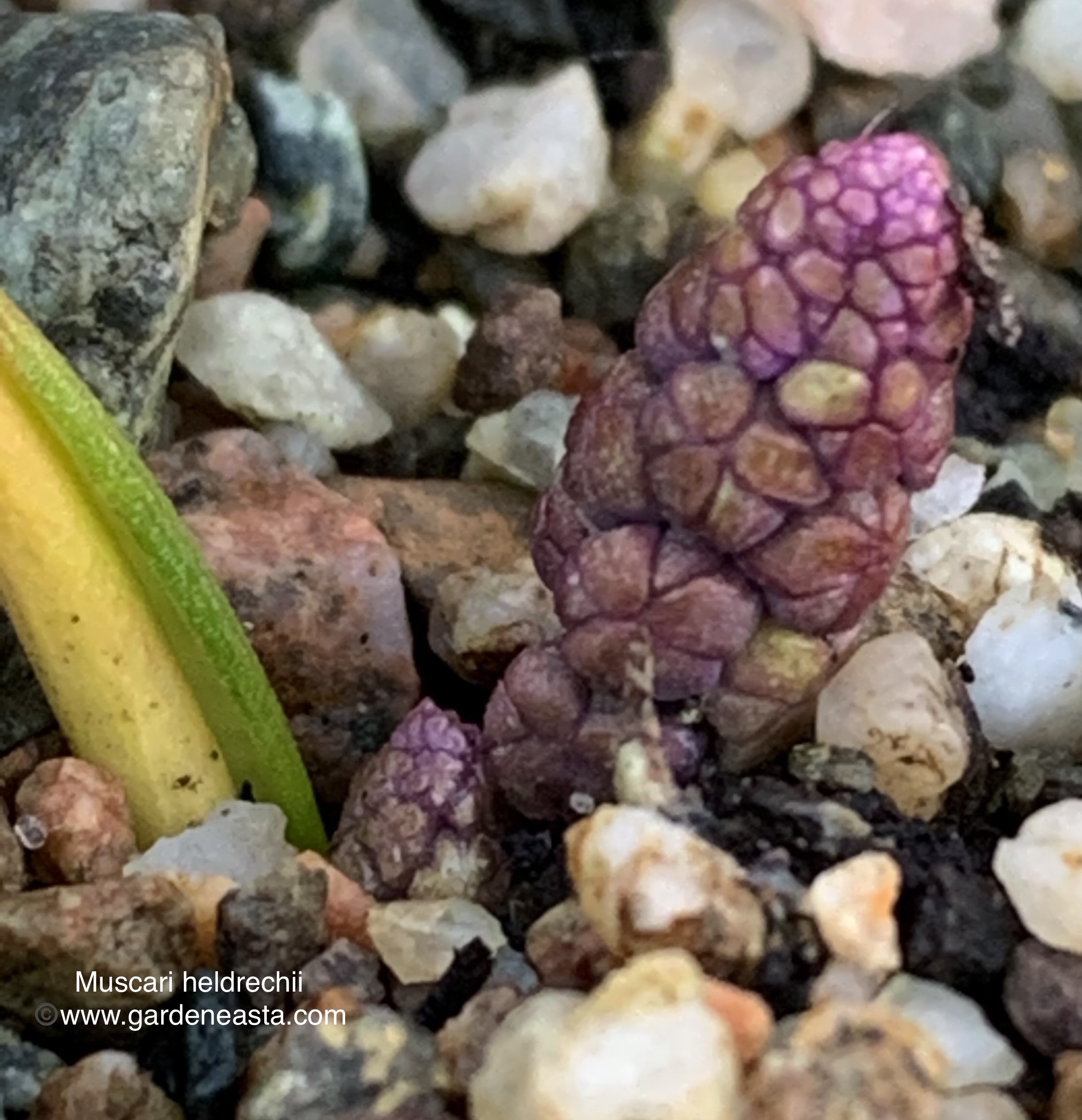 ‘Muscari heldreichii is a species from Greece with just a few grey-green leaves, and a head of rounded, bright blue flowers, partly closed at the mouth with a white rim, which then flares outwards.